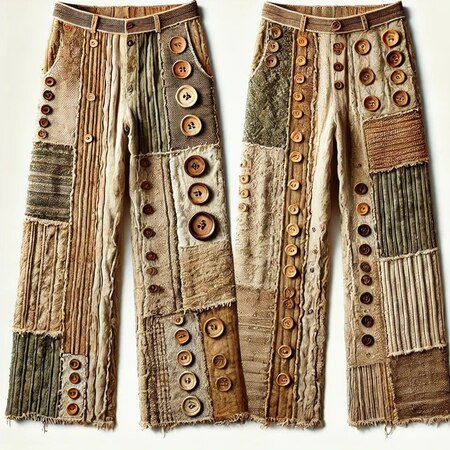2 — in keeping with the style of patchwork, rough tailoring and plenty of buttons, generate trousers