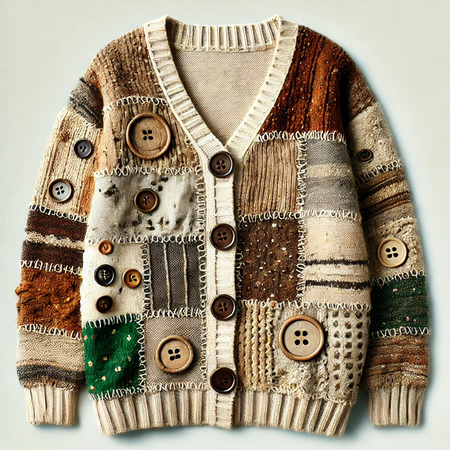1 — in keeping with the style of patchwork, rough tailoring and an abundance of buttons, generate a cardigan.