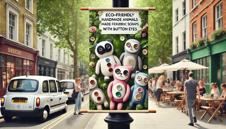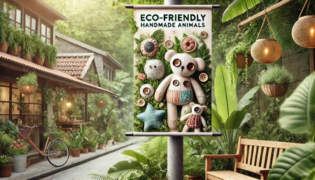 1 — generate a photo of an outdoor advertising banner for an eco-friendly fabric and soft toy shop in patchwork style with button eyes and large stitches, with nature accents.