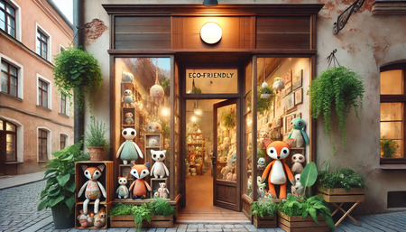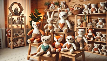 2 — generate a photo of the inside of an eco-friendly patchwork style fabric and soft toy shop with button eyes and large stitches, nature accents, with racks of toys.