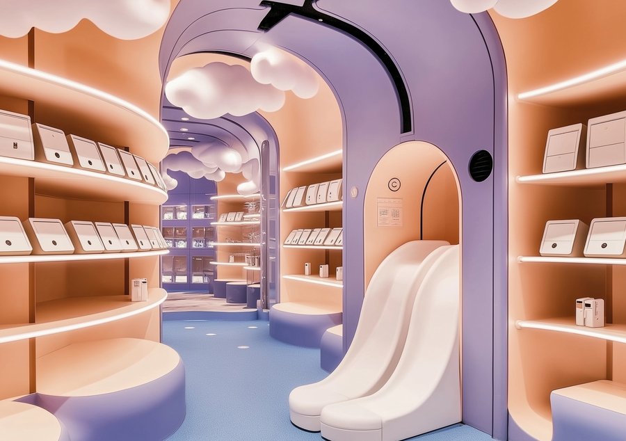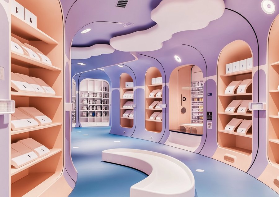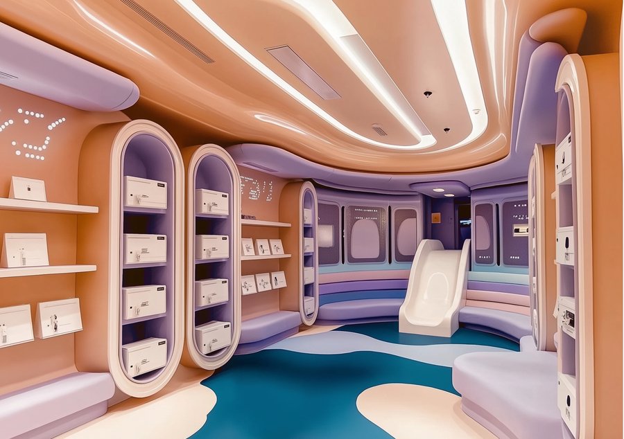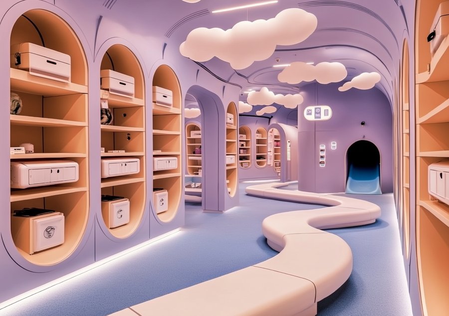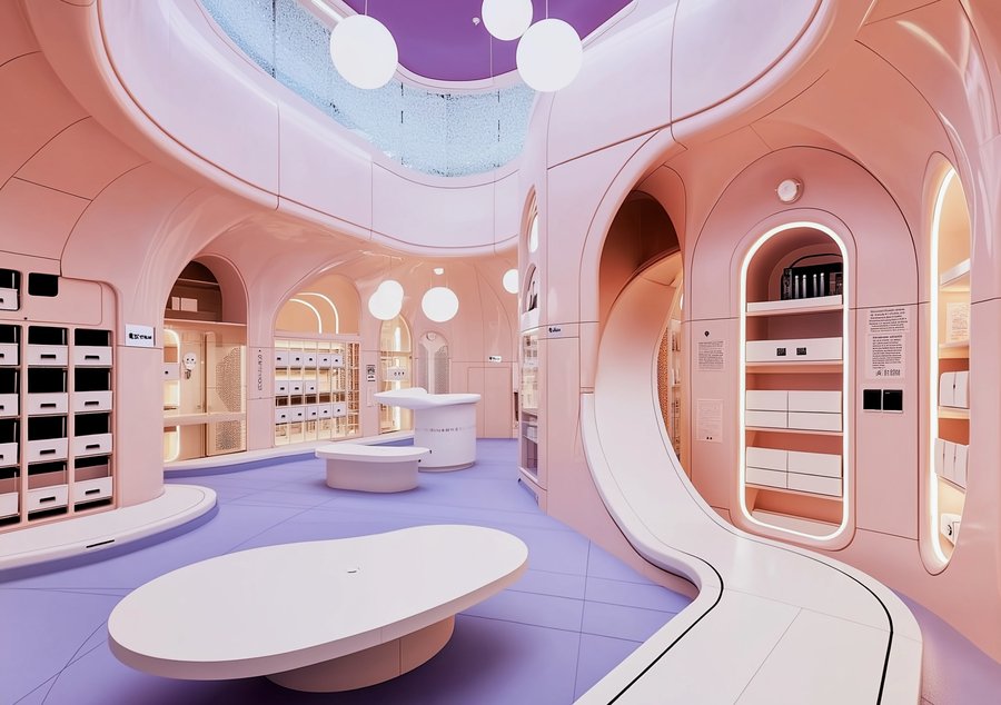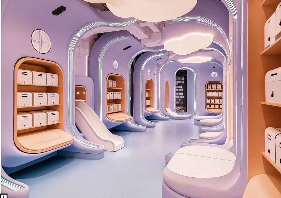 Midjourney: Create a futuristic office space, connected by organically curved structures in shades of blue, white and soft purple. Include large floor-to-ceiling windows that let in natural light and soft pastel lighting that creates subtle gradients throughout the room. There should be floating clouds outside the window. In the center of the room there should be a reception desk, in the same style as the rest of the room. Behind the desk there should be a chair. And on the desk there should be a white computer. There should also be a white mailbox on the table.