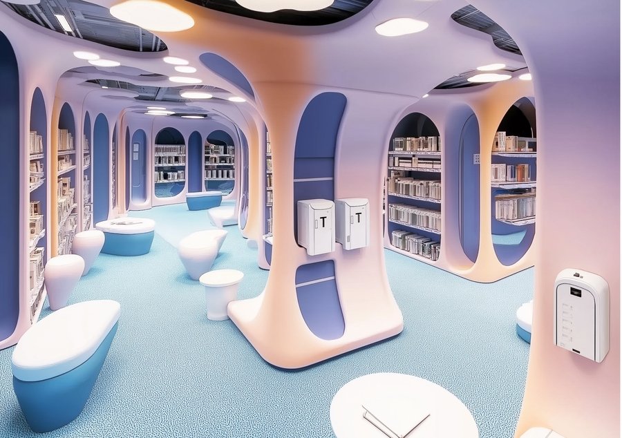 Midjourney: Create a futuristic open-plan office space with multiple levels connected by organically curved structures in shades of light blue and white. The architecture should have large sweeping arches and openings that create smooth transitions between floors. Include large floor-to-ceiling windows that let in natural light, and soft pastel lighting that creates subtle gradients across the room. There should be floating clouds outside the window. Furnish each level with modern minimalist furniture in light blue and white, and add seating areas with round tables for collaboration. Add a white mailbox on each desk.