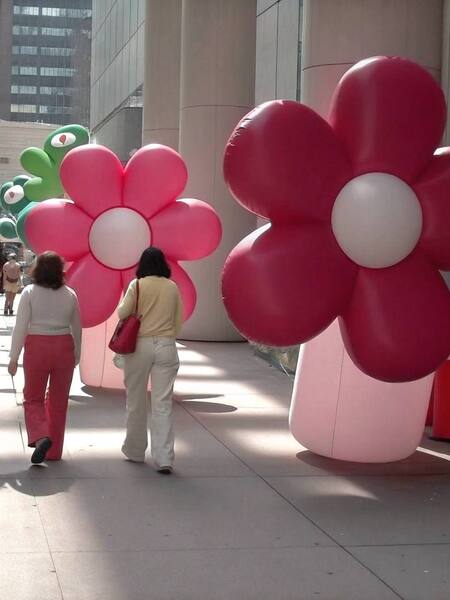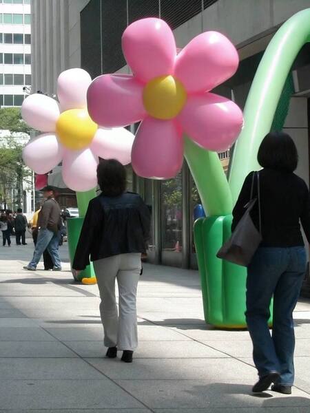 Надувные бело-розовые цветы в городской среде
