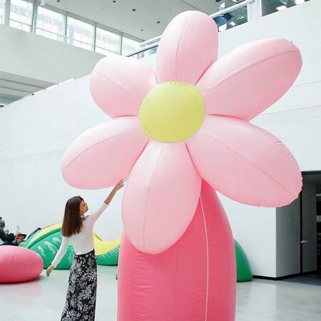 Надувные бело-розовые цветы на выставке