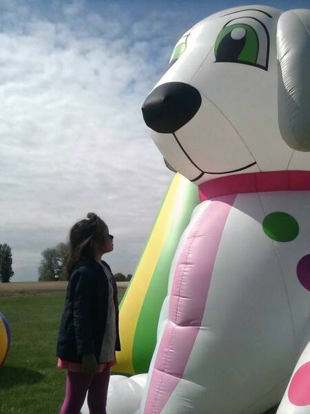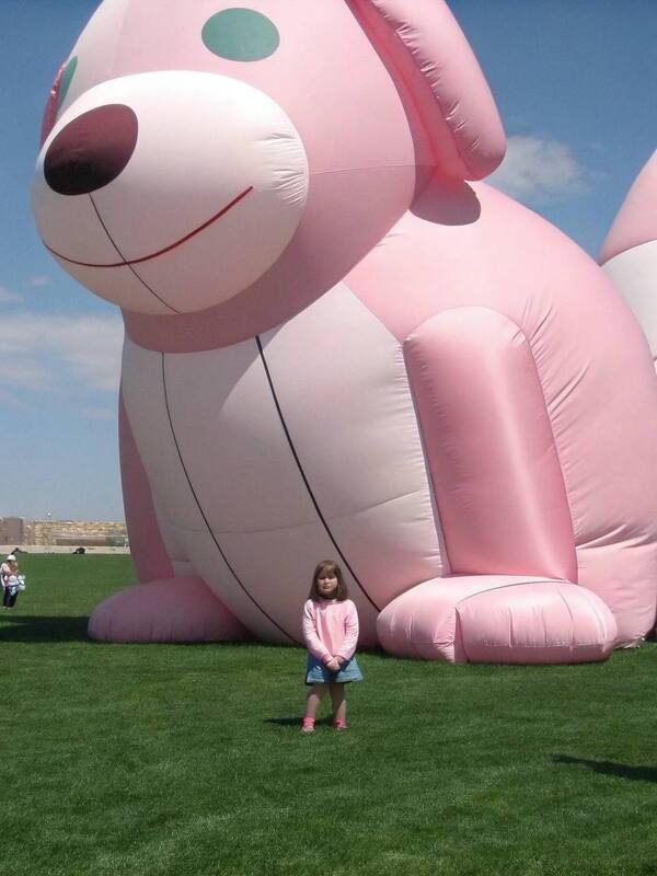 1. «A colorful and energetic scene of a large inflatable pink doll on top of a bouncy inflatable slide on a busy playground. Children are seen playing around the slide, laughing and having fun. 2.A wide shot of a child playing next to an enormous, inflatable, cartoon-style white dog doll. The dog has exaggerated features, like big floppy ears and a short, round snout. The scale is such that the dog towers over the child, emphasizing its size. The dog looks friendly and approachable with a gentle smile. The child is laughing and trying to hug the dog. The scene is set in a park with a blue sky and green grass. The image is rendered with a focus on bright colors and clear outlines, capturing the playful and cartoonish nature of the subject.