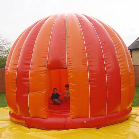 «Цветные надувные батуты для детей в ярких оттенках, расположенные на заднем дворе дома»