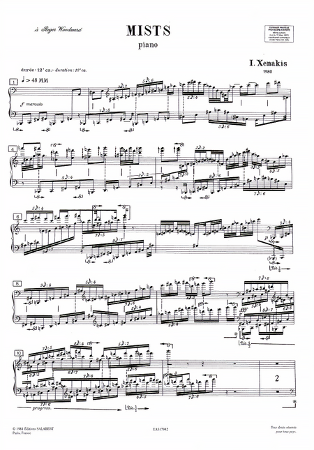 Ноты «Metastaseis» для шестидесяти одного инструмента соло. «Mists» для фортепьяно. Автор Янис Ксенакис. 1980 г.