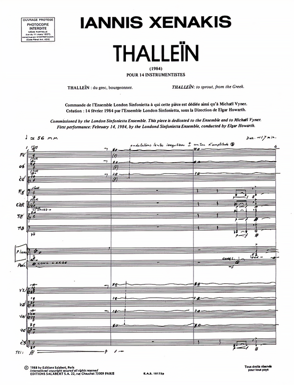 Ноты «Metastaseis» для шестидесяти одного инструмента соло. «Thallein» для камерного оркестра. Автор Янис Ксенакис. 1984 г.