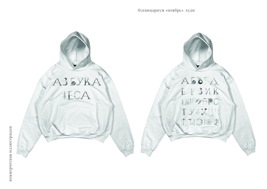 Буквицариум «Ноябрь» выполнен в традиционной технике (тушь и акварель) и рассказывает историю про путешествие в лес и встречу с его обитателями, живыми и прочими. Несмотря на кажущуюся мрачность, «Ноябрь» — очень живой и графичный шрифт, в котором каждая буквица обладает своим неповторимым характером.