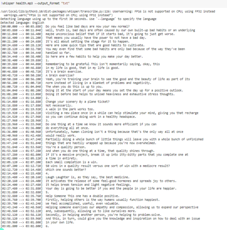 Запустив команду whisper, которой необходимо передать имя звукового файла для распознавания, мы получает транскрипцию в текстовом формате. Это упрощает расшифровку видео и уменьшает временные затраты на транскрипцию вслед за диктором.