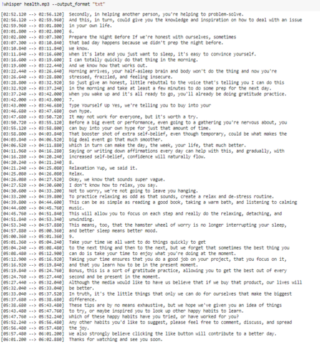 Взяв за основу два противоположных ролика о Вредных и Полезных привычках, с помощью кода на языке Python, нейросеть OpenAI Whisper проанализировала полный хронометраж поучительных видео и выдала два текстовых файла с расшифрованной речью на английском языке.