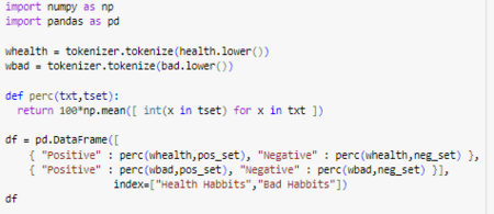 Проводя эксперимент с полученными данными, я получила процент всех позитивных слов в тексте, предварительно создав таблицу, чтобы исходя из нее создать круговые диаграммы: