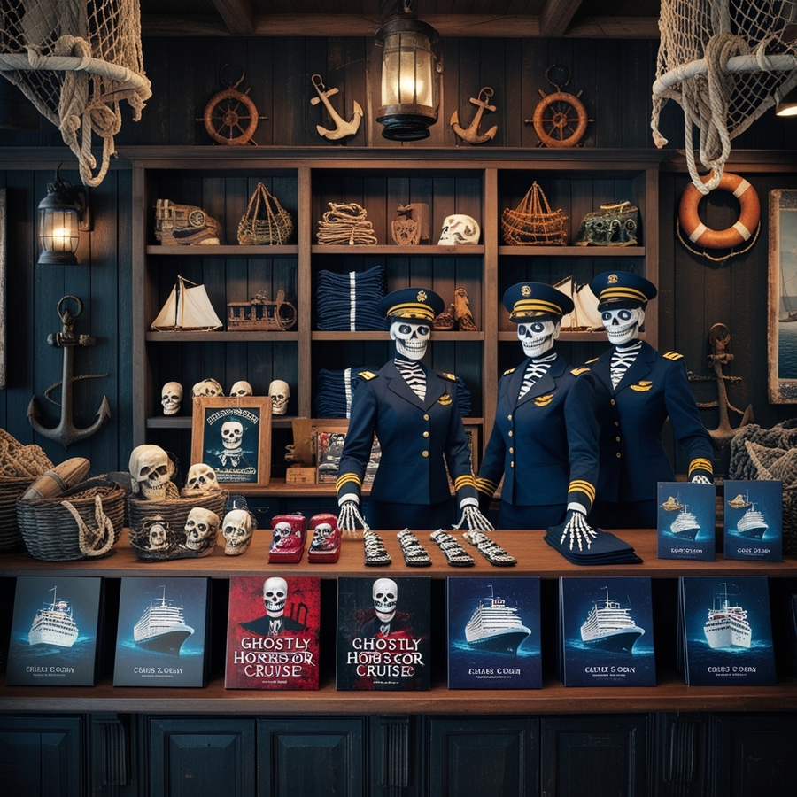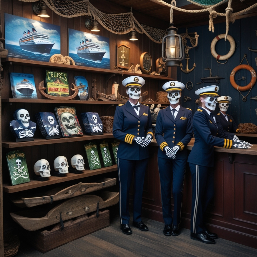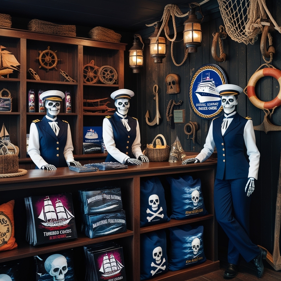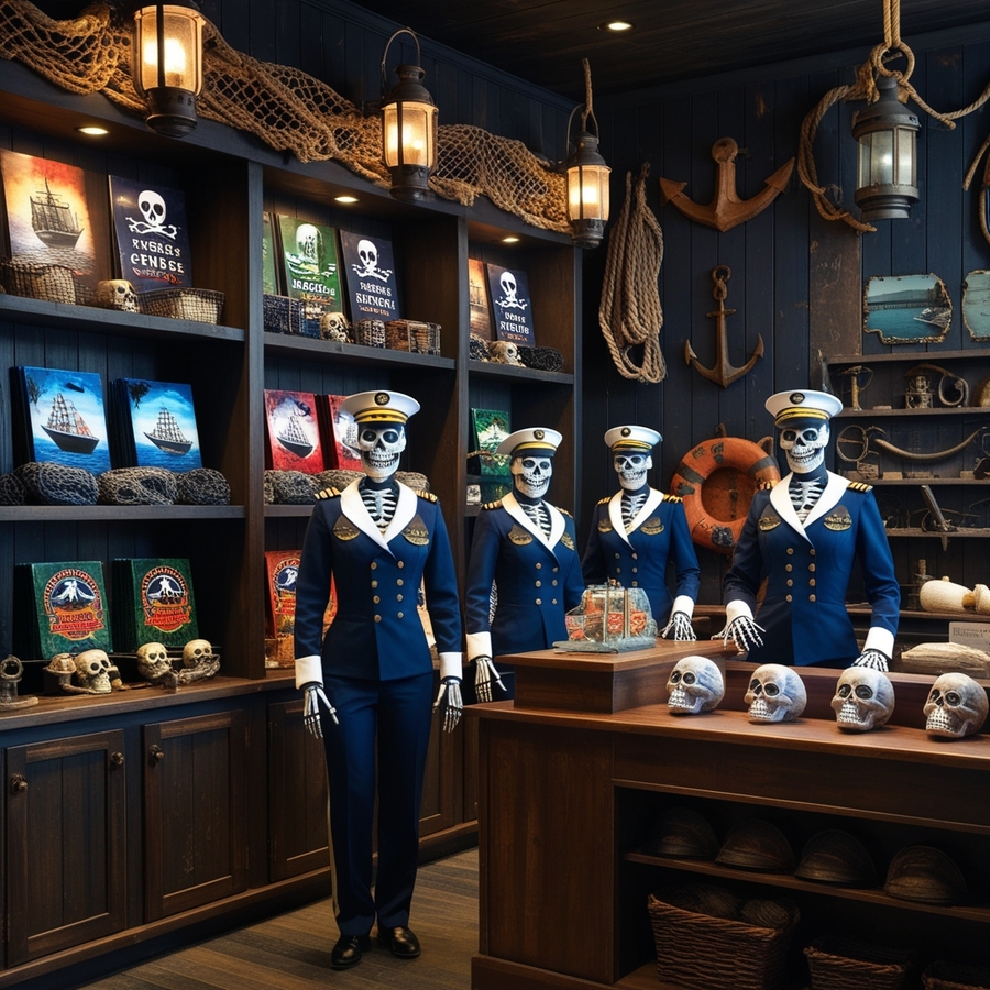 Нейросеть: https://leonardo.ai/ Промпт: rustic store with wooden shelves and old-fashioned lanterns, filled with an assortment of merchandise for a cruise company specializing in themed and horror cruises, including posters, model ships, and souvenirs with eerie designs and logos of ghostly ships and skulls. The store’s employees, dressed in full skeleton costumes with navy blue uniforms underneath, complete with golden epaulets and caps, stand behind the counter or restock shelves, their bony faces painted with friendly smiles, amidst a backdrop of dark wood paneling, fishing nets, and old anchors. The walls are adorned with vintage navigation instruments, antique life preservers, and faded photographs of old cruise ships, creating a sense of nostalgia and foreboding.