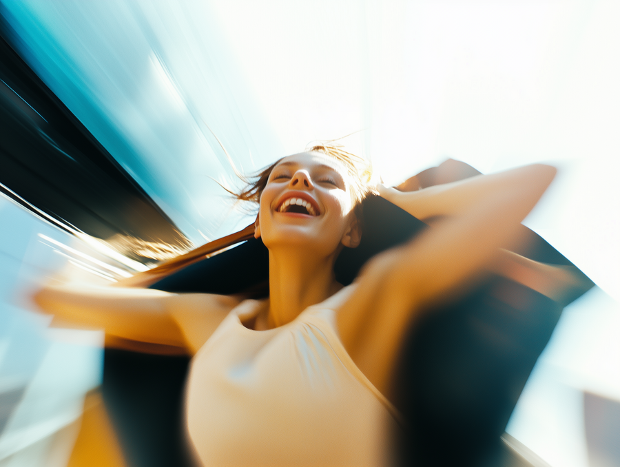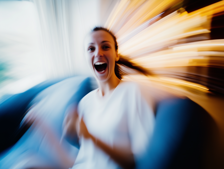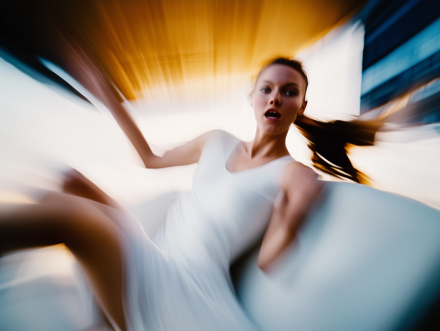 Промпт для MidJourney: «Surprised young woman a sofa is flying in the air», также было использовано другое сгенерированное изображение в качестве стилевого референса.