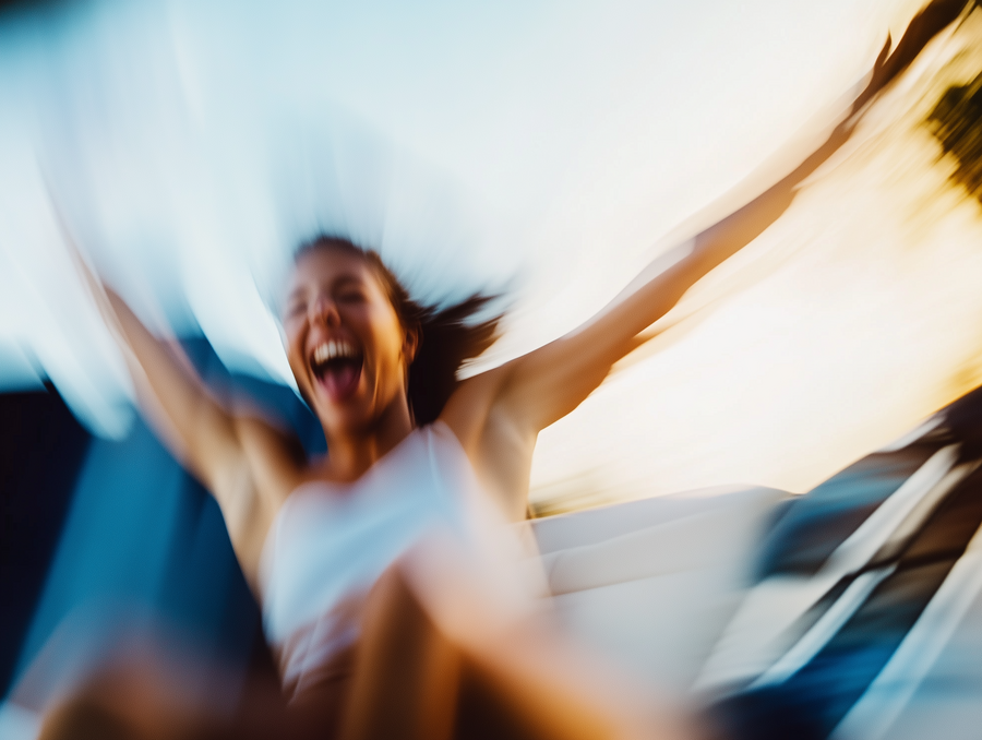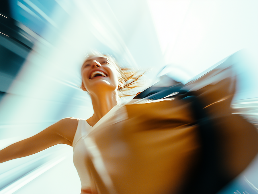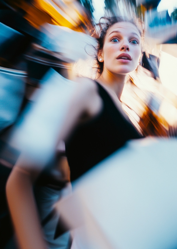 Промпт: «a close-up Surprised young woman in the foreground, eyes wide open, standing casually. In the background, numerous shopping bags of different shapes and colors float in mid-air as if defying gravity, creating a surreal and dynamic visual.». С использованием в качестве стилевого референса одного из сгенерированных изображений.