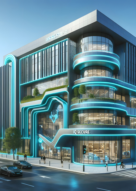 a outside view a building for a luxury technologies security company named iq secure in blue and green tones