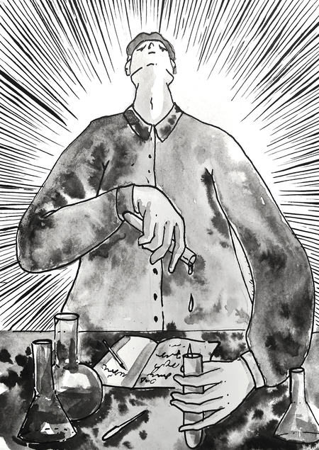 Техника исполнения: тушь + чернила, видимые при ультрафиолетовом свете. Персонажи нарисованы при помощи особых чернил на фреймах, где кошка и Гриффин стали невидимыми.