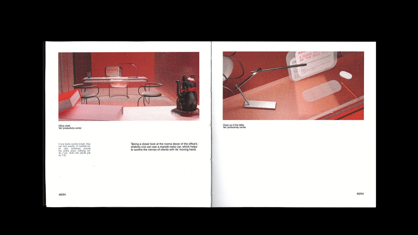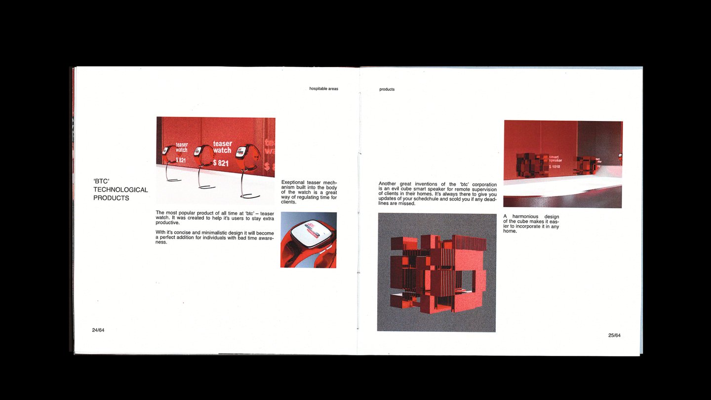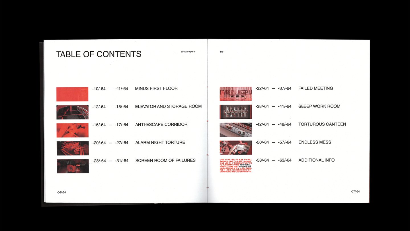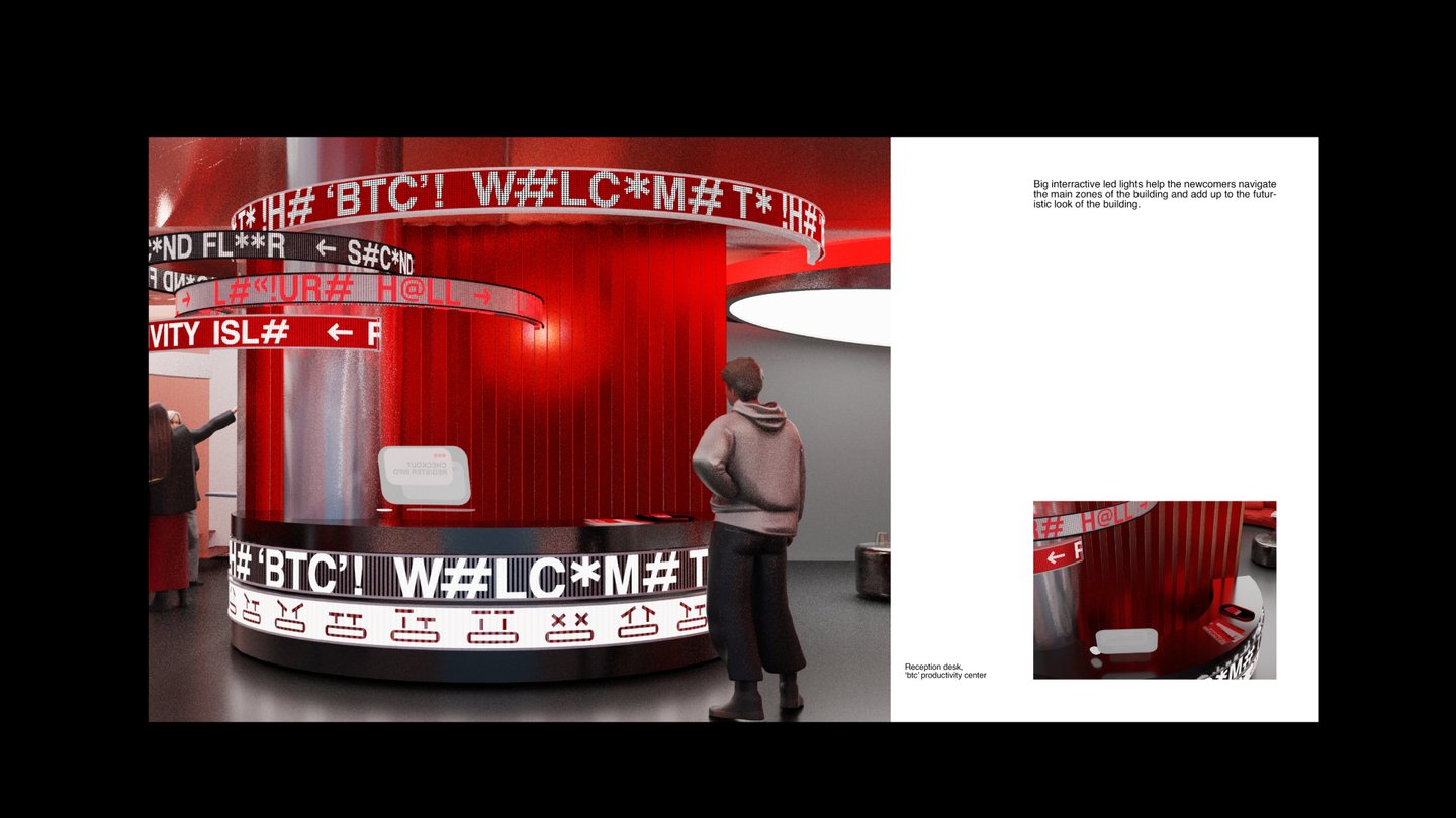 Центр продуктивности компании мирового масштаба 'btc', где у всех посетителей есть возможность на время забыть о заботах окружающего мира, погрузиться в работу или стать слушателями познавательных лекций. Однако некоторым, особо злостным, опаздунам придётся вопреки своим желаниям увидеть «обратную сторону медали» — пройти курс обратной реабилитации в подземной части пространства.