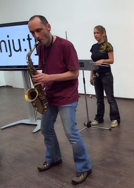 Performance/Video Documentation. Impossible Community exhibition 2011 / MMI Gogolev Boulevard. Several musicians are jointly improvising, but the audience does not hear the result of their efforts. It feels like someone turned off the sound or the audience was deaf. Each instrument is dissected in such a way that it is impossible to extract a musical sound from it (the saxophone arm is missing the cane, the electrical tools are not connected to the power source, and there is no amplifier). However, participants [mju: t] continue, as envisaged by the rules of jamming, collective improvisation, to «play» in continuous communication with each other, including through gestures, views, mimics, as if everything was happening on a concert set with full technical equipment. But they really hear each other and play the music that comes from within the interaction of their professional community.