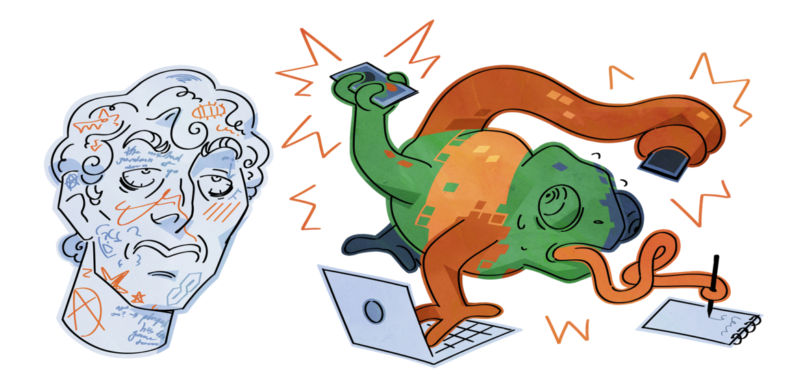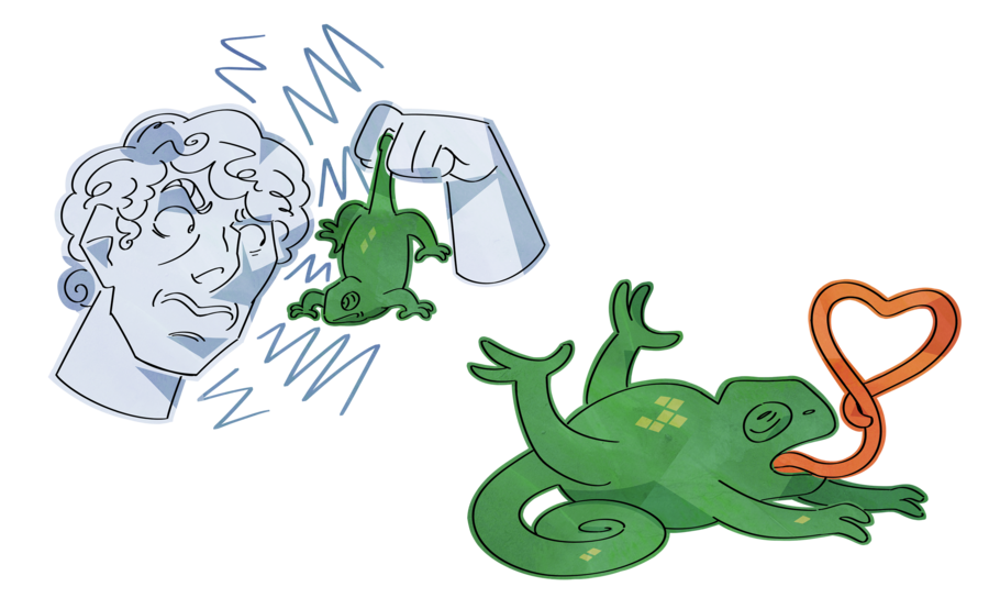 Стикерпак для программы УКИ с ее маскотами — хамелеоном и Давидом. В своей серии иллюстраций