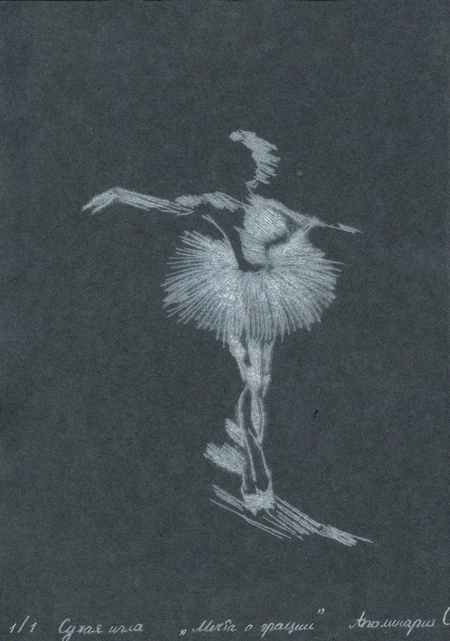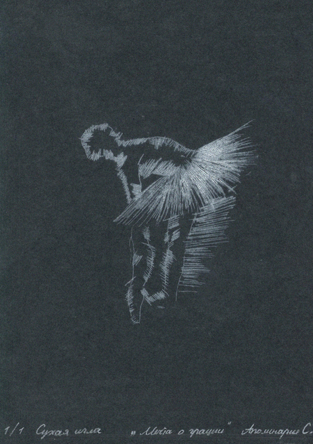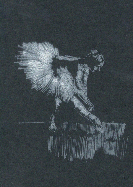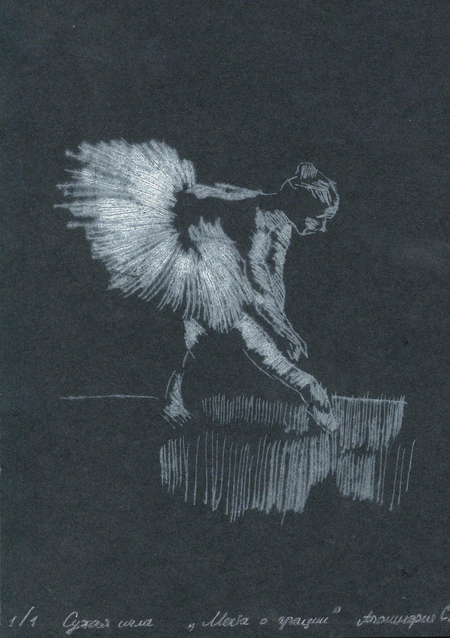 Темный фон становится символ боли от физических нагрузок. Белой краской, изображенные балерины, как почти эфемерные, неземные фигуры, подчеркивают, что они — недостижимый идеал. Балет был не только искусством, но и тяжелым трудом, и этот контраст между физической болью и стремлением к красоте выражен в каждой работе. Техника сухой иглы помогает передать текстуру, детали и глубину, создавая четкие линии, которые усиливают ощущение напряжения и красоты одновременно.