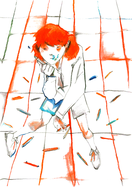 Девочка сидит в кабинете и скучает. Вокруг энергичные одноклассники, с которыми ей некомфортно. Девочка засовывает карандаш в рот и грызет его, наблюдая за тем, что происходит вокруг. Она так увлеклась процессом, что даже не заметила, как съела весь карандаш. Стёрка осталась лишь напоминаем.
