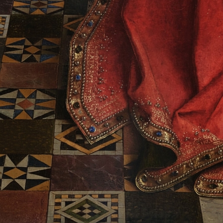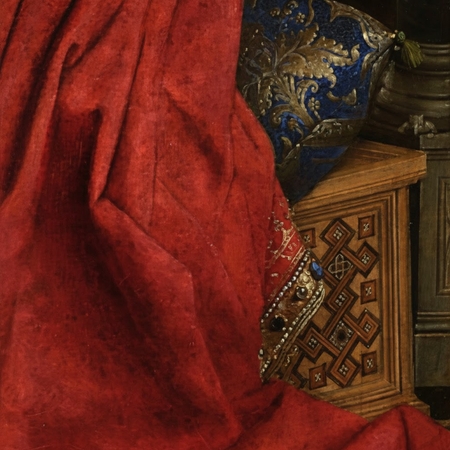 Техническое Мастерство: Микропись и Свет. Микроскопическая проработка зеркала и его деревянной рамы, украшенной десятью медальонами со сценами Страстей Христовых, демонстрирует виртуозное владение масляной техникой. Для передачи мельчайших бликов на поверхности выпуклого стекла, а также для создания эффекта глубины в отражении, ван Эйк использовал тончайшие слои лессировок. Блики не выглядят хаотичными, а строго подчинены законам света, приходящего из окна слева. Эта деталь подчёркивает не только что видно, но и как это видно.