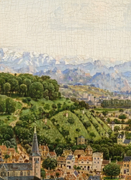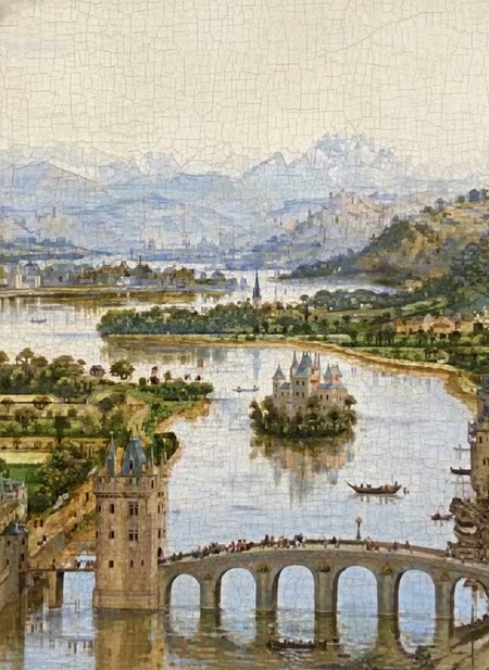 Этот переход от детализированного коричневого к размытому синему является прямым применением «Оптической революции» Ван Эйка к пейзажному жанру, превращая детализацию цвета в ключевой инструмент построения пространства.