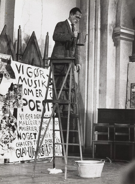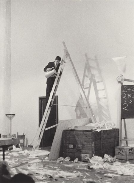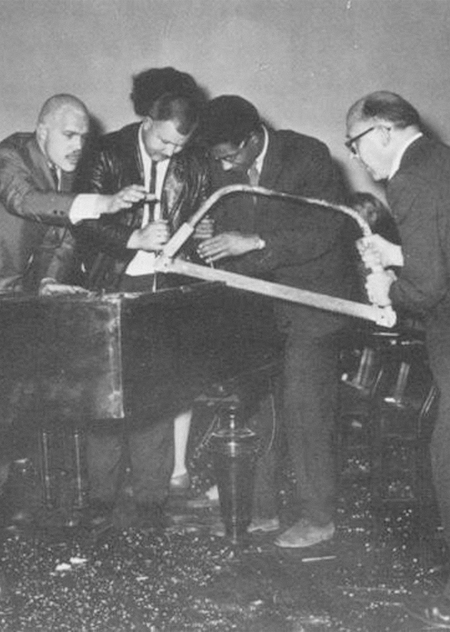 Джордж Мачюнас, Дик Хиггинс, Вольф Фостелл, Бенджамин Паттерсон и Эмметт Уильямс исполняют фортепианные выступления Филипа Корнера, перформанс 1962
