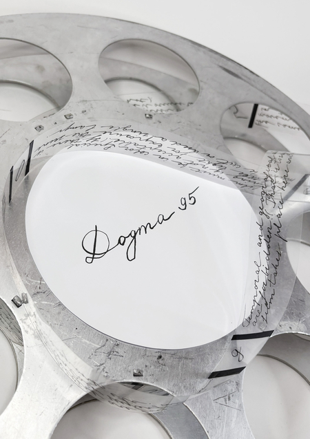 Манифест я пишу тонким пером на бумаге, сканирую изображение и печатаю на прозрачной пленке шириной 35 мм. Дополнительной основой объекта становится катушка для кинопленки.