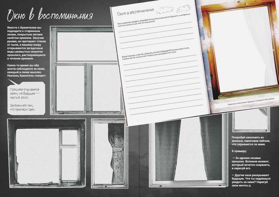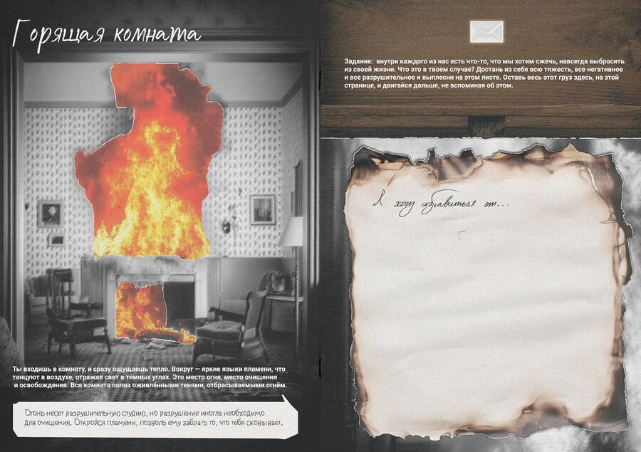 Дом потерянных писем — зин-самопомощник по проживанию горя. Читатель погружается в путешествие по загадочному дому, где каждая комната — это этап принятия.