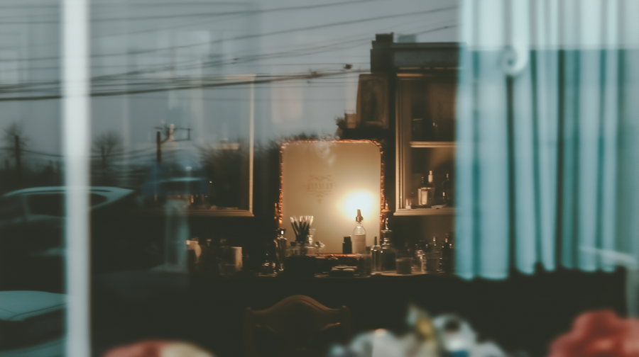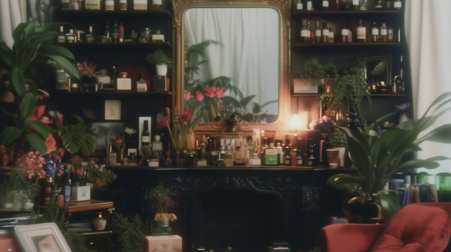 ld-fashioned perfume counter with handwritten labels, perfume bottles glowing softly in the dark, gentle smoke in the air, cozy mysterious home aesthetic https://s.mj.run/f7776y92Om0 --chaos 20 --ar 16:9 --style raw --v 6.1 --stylize 200 --profile g4npyio