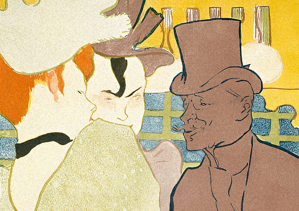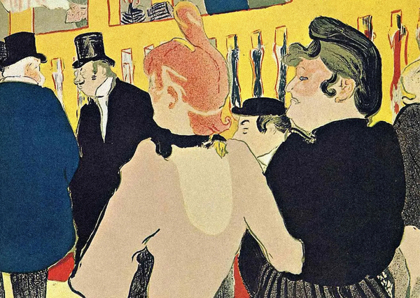 В работе «В Мулен Руж, Ла Гулю с её сестрой» мы видим двух статных женщин, которые как будто с презрением смотрят на мужское окружение. Поза с рукой, которая упирается в бок, усиливает напряжение. Но при этом чётко считывается усталость, отчуждение и лёгкий цинизм, который исходит от этих образов.