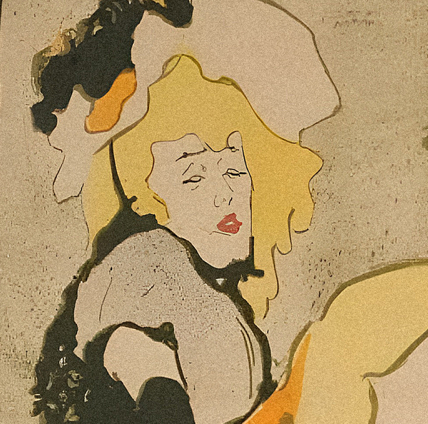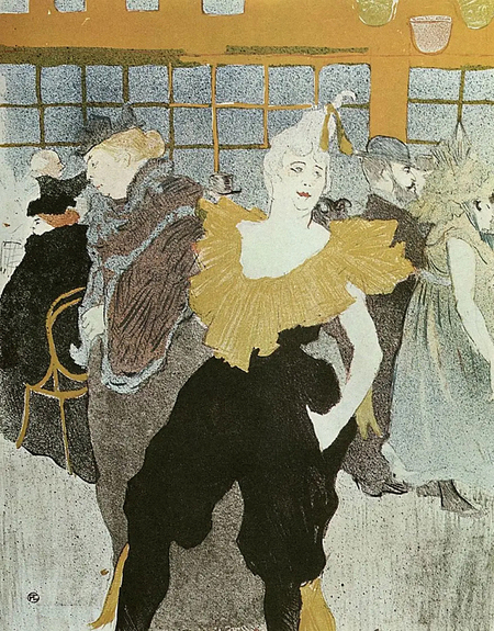 Это плакат для одного из популярных кабаре на Монмартре. Несмотря на динамику движения девушки и яркость её образа, выражение лица меланхолично, она погружена в собственные мысли и переживания.