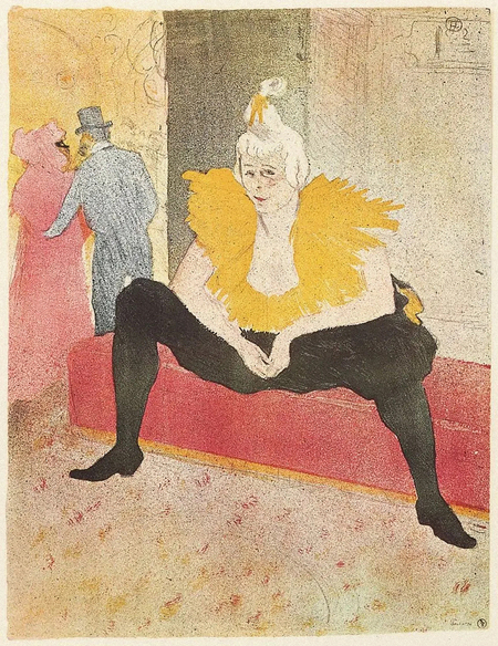 В работе «Клоунесса в Мулен Руж» автор изображает девушку не через развлечения, а через труд. Мы видим героиню не в момент триумфа на сцене, а за кулисами. Её поза выражает повседневность, расслабленность; лицо подчёркивает года труда, которые сказались на её внешности. Труд для женщины Тулуз-Лотрека — это способ выживания и самореализации.