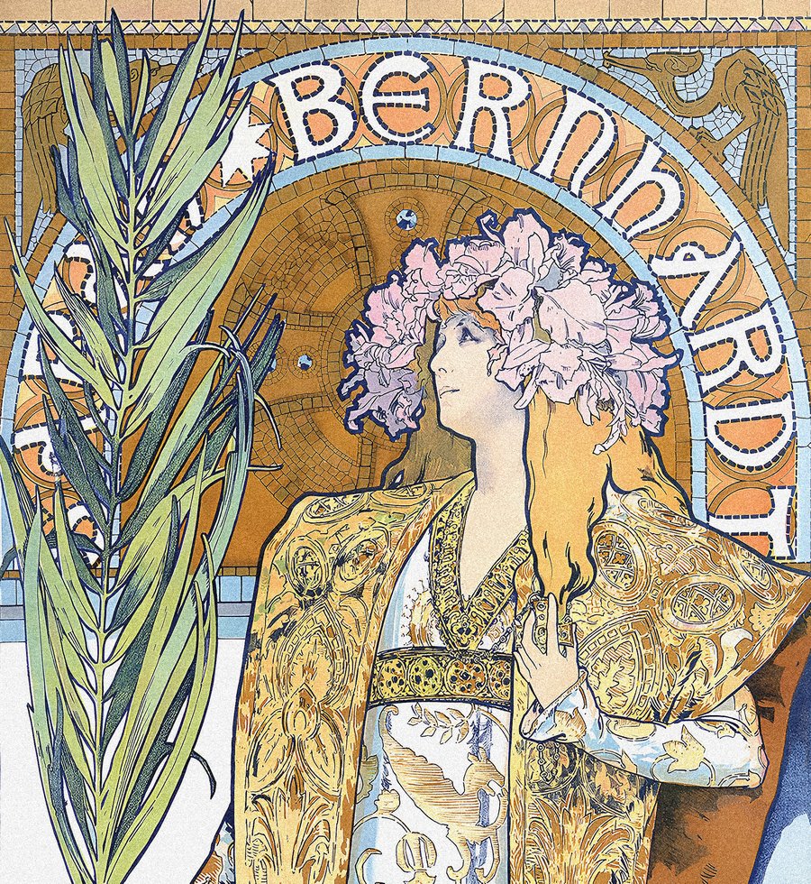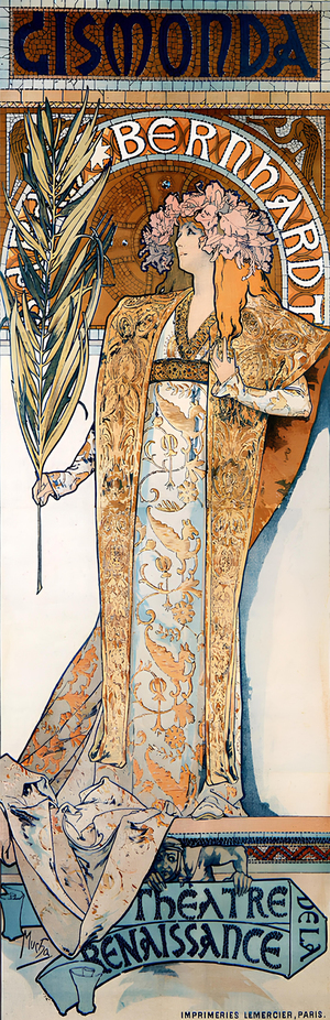 Афиша была заказом актрисы Сары Бернар для ее театра «Ренессанс» в Париже и предназначалась для театральной постановки греческой мелодрамы в 4 действиях «Жисмонда», которую в 1894 году написал Викторьен Сарду. Несмотря на театральный контекст, Муха лишает героиню драматизма. Она стоит неподвижно, как святая, в византийском венце. Её лицо — маска спокойствия. Золотистый фон, в виде мозаики, который напоминает церковный купол.