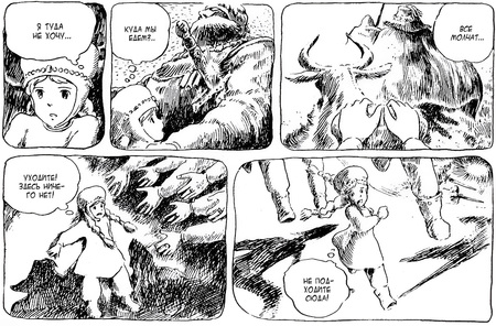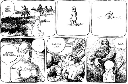 Объемы и глубину пространства художник передает с помощью штриховки, создающей плавные переходы и делающей кадры более живописными. Такой подход свойственен не стандартному языку японской манги, а европейскому комиксу: большое влияние на Миядзаки оказало творчество Мебиуса.