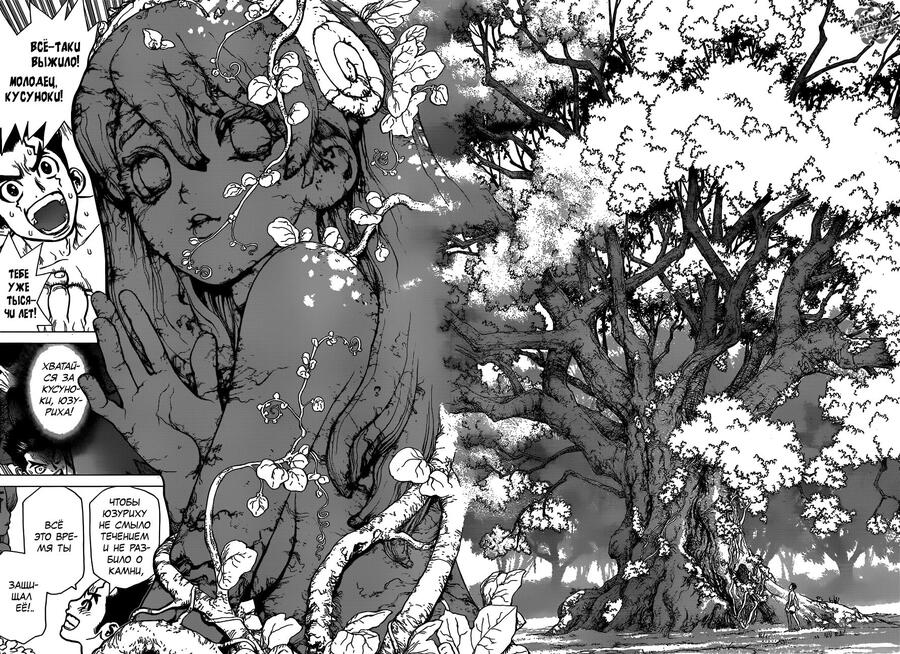Это произведение поразило меня лиричностью и внешним спокойствием, не свойственным другим историям этого жанра. Тогда я решила подробнее проанализировать «Навсикаю из долины ветров» и сравнить ее с другой постапокалиптической мангой, уже более новой и с характерной для Японии подачей и визуальным языком. Выбор пал на «Доктора Стоуна» авторства Риитиро Инагаки с иллюстрациями Боити — впечатлившее меня произведение, обладающее противоположным манге Миядзаки посылом и объектом внимания.