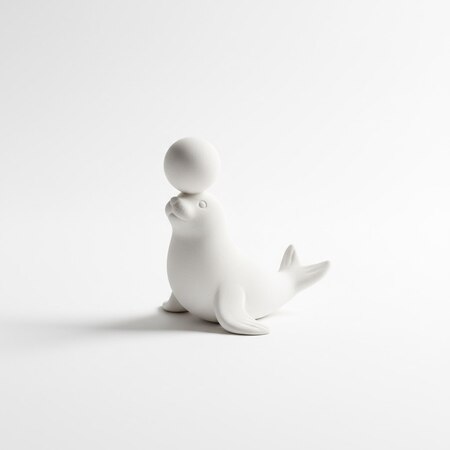 Промт: белая керамическая фигурка, милый цирковой тюлень с мячом на носу, минималистичное фото, белый фон.