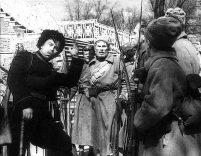 Картины военного времени еще более наполнены демонстрацией образов настоящих героев, идеями об объединении и коллективизации — все это также прослеживается в синхронных движениях актеров, массовости кадра. Однако в связи с великой трагедией герои раскрываются с более трогательной и слабой стороны — это не акцент на личности, но это наделение героев качествами и возможностями тела, которые делают их более живыми: трясущиеся руки, пот, печальный и усталый взгляд. Все это существует наряду все с теми же привычными жестами решительности, однако чуть оживляет памятники героев, придавая им драматизма. Это наталкивает на мысли о последующем внутреннем монологе героя. Но важно отметить, что цель этого не демонстрация личности, а раскрытие достижений, преодоления и все той же величественной борьбы.