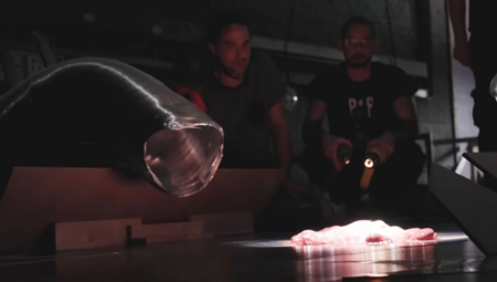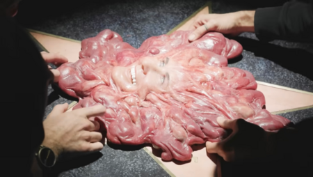 Сцена с органическим «кассетоприёмником» в животе реализована через многоуровневую протезную систему: под латексной «кожей» находился механический карман с мягкими резиновыми стенками, управляемый скрытыми тягами. Кассета физически входила в это углубление, а края отверстия синхронно сокращались, имитируя работу мышц, так что акт приёма медиасигнала выглядел как физиологический процесс, а не как трюк.