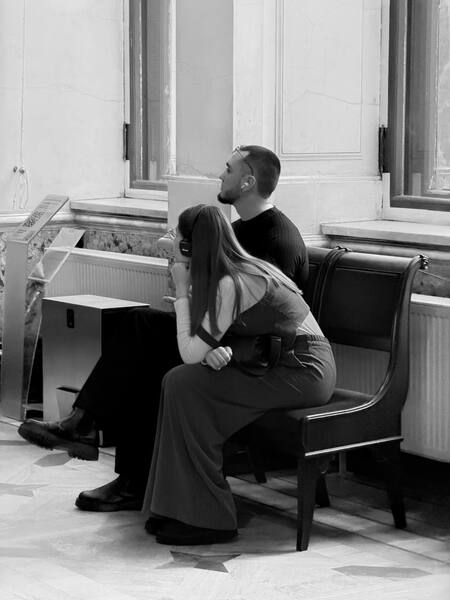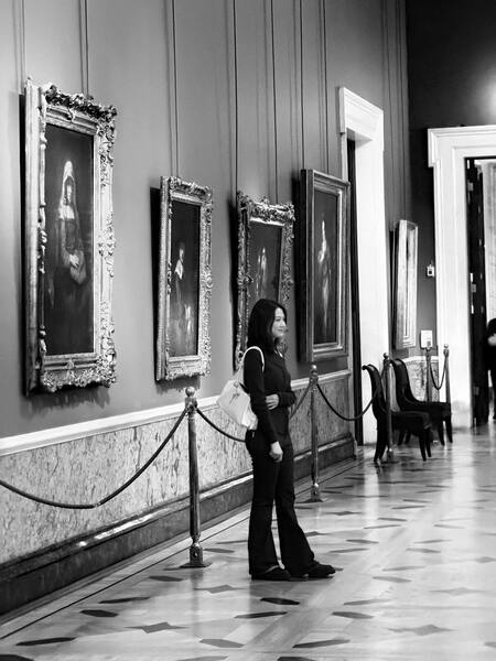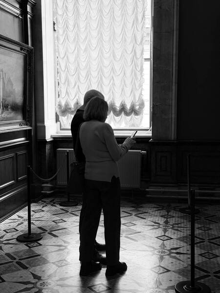 Первая серия фотографий показывает, что Эрмитаж — это не только красивые залы и старинные картины. Это ещё и место, где происходит настоящая жизнь. Здесь люди сидят на полу, болтают с подругами про искусство или просто делают селфи. Я хотела показать эти простые, но важные моменты. Они делают Эрмитаж живым и близким каждому из нас.