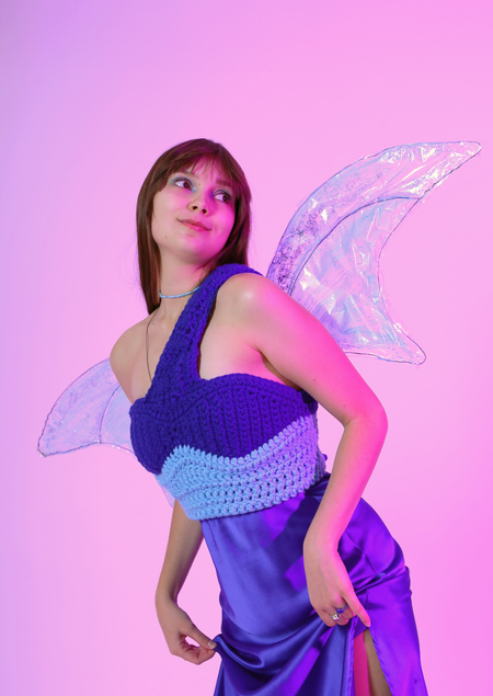 Я хотела создать что-то необычное и волшебное из привычных нам материалов. Сам процесс вязания окутан магической дымкой. Монахи вяжут браслеты, наговаривая на них молитвы. Мамы вяжут свитерочки своим детям, думая о том, чтобы они росли здоровыми. А я связала топы, чтобы девушки, надевшие их, перевоплотились в фей.