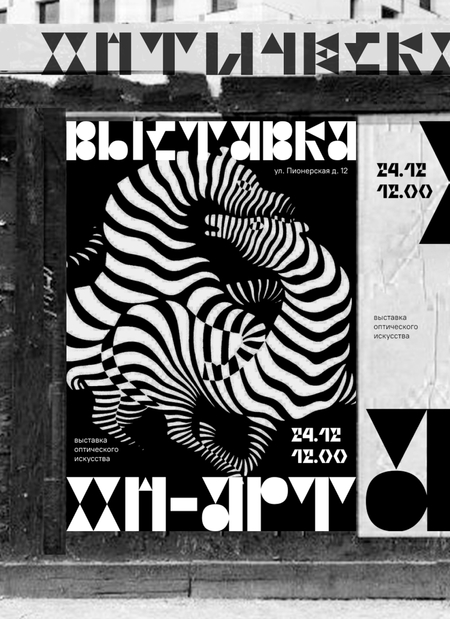 Айдентика выставки построена на модульном шрифте Retro Flux. Выставка посвящена оптическому искусству, которое зародилось в начале 20-го века.