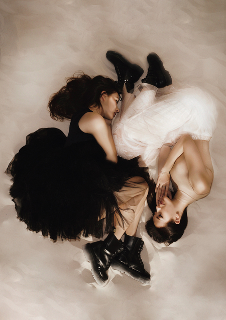 фэшн-съёмка, где модели-близнецы олицетворяют внутренний мир одного человека: его противоположные стороны и состояния