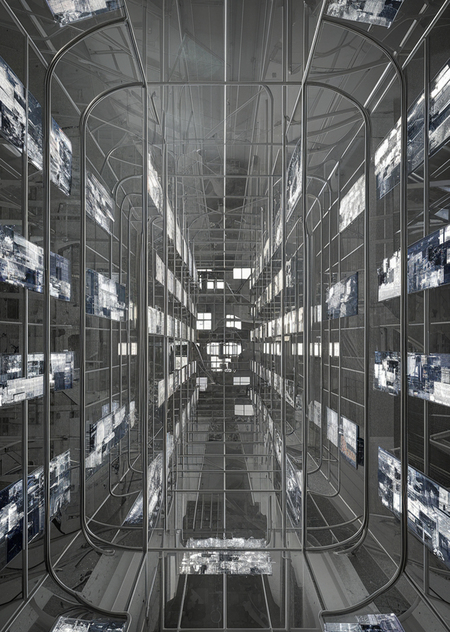 Пространство музея сгенерировано в Ideogram по аналогии с самим зданием. Prompt: ’Futuristic halls in a museum of memories. All in shades of gray. A museum exhibition dedicated to the memories of one person. The space is filled with various objects, photographs and artifacts representing key moments and experiences from a person’s life’.