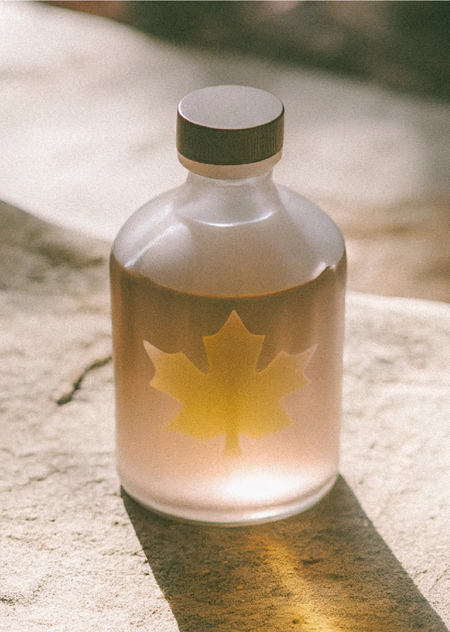 promt: a rectangular vertical minimalistic light cardboard box for maple syrup. there are label with microtypography serif font Klenno in pure colors