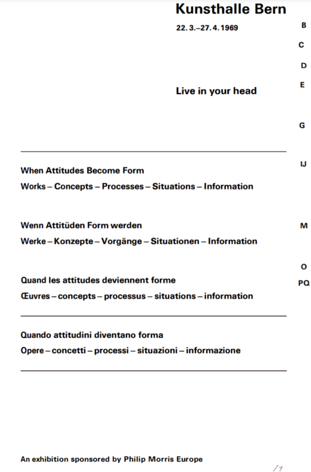 Szeemann, H (1969), When attitudes Become Form: Works — Concepts — Processes — Situations — Information. (2nd edition, 2006) Bern: Stämpfli Press.