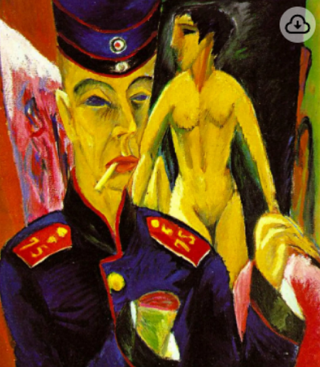 Елена Фигурина, без названия, ок. 1980 г./ Эрнст Людвиг Кирхнер, «Автопортрет в солдатской форме», 1915 г.