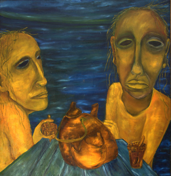 Лица обеих фигур имеют насыщенный желто-охристый оттенок, который выглядит определенно нездоровым, намекая на истощение и безысходность.